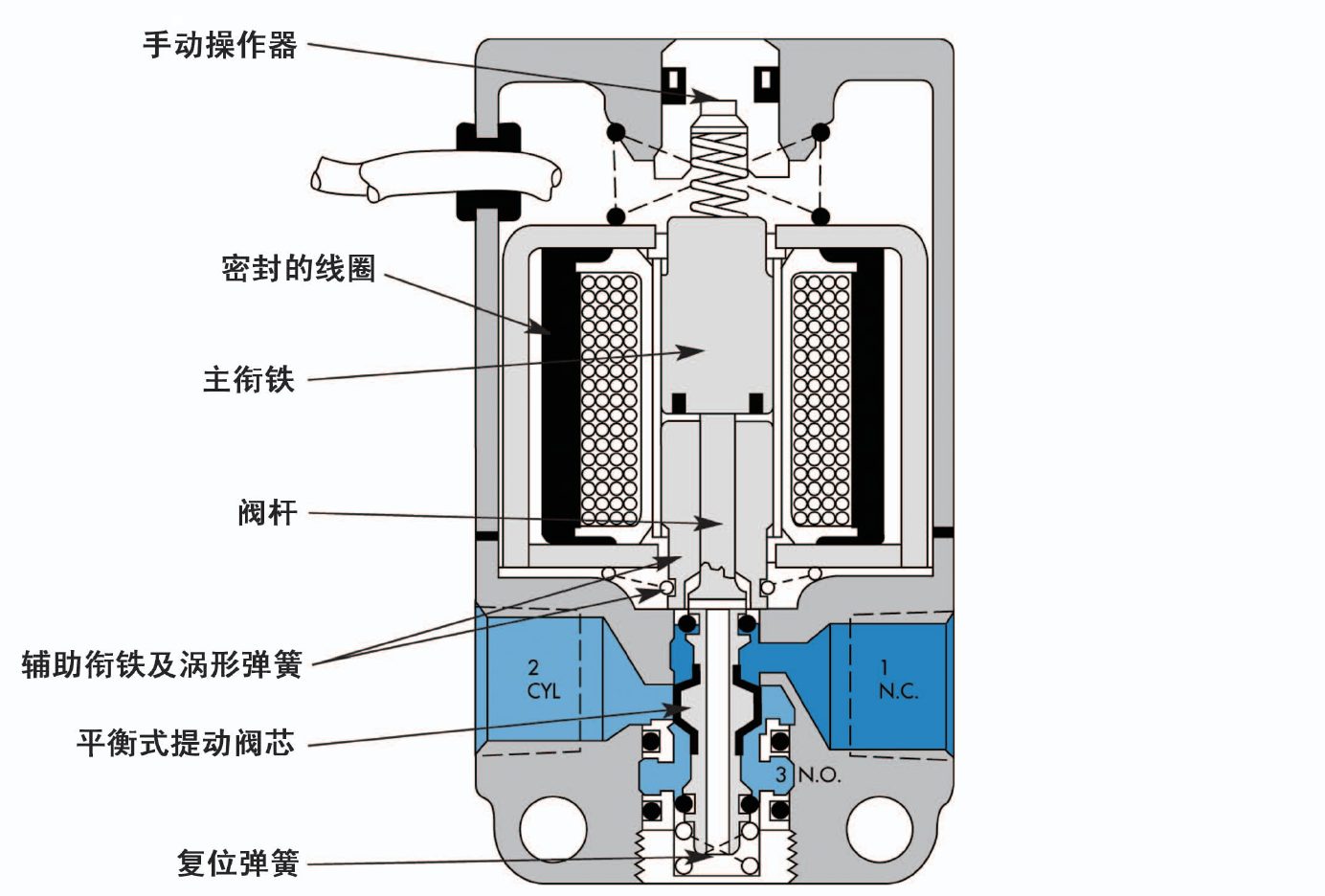 電磁閥是由電磁線圈和磁芯組成,是包含一個(gè)或幾個(gè)孔的閥體。當(dāng)線圈通電或斷電時(shí),磁芯的運(yùn)轉(zhuǎn)將導(dǎo)致流體通過(guò)閥體或被切斷,以達(dá)到改變流體方向的目的。電磁閥的電磁部件由固定鐵芯、動(dòng)鐵芯、線圈等部件組成;閥體部分由滑閥芯、滑閥套、彈簧底座等組成。電磁線圈被直接安裝在閥體上,閥體被封閉在密封管中,構(gòu)成一個(gè)簡(jiǎn)潔、緊湊的組合。我們?cè)谏a(chǎn)中常用的電磁閥有二位三通、二位四通、二位五通等。這里先說(shuō)說(shuō)二位的含義:對(duì)于電磁閥來(lái)說(shuō)就是帶電和失電,對(duì)于所控制的閥門(mén)來(lái)說(shuō)就是開(kāi)和關(guān)。