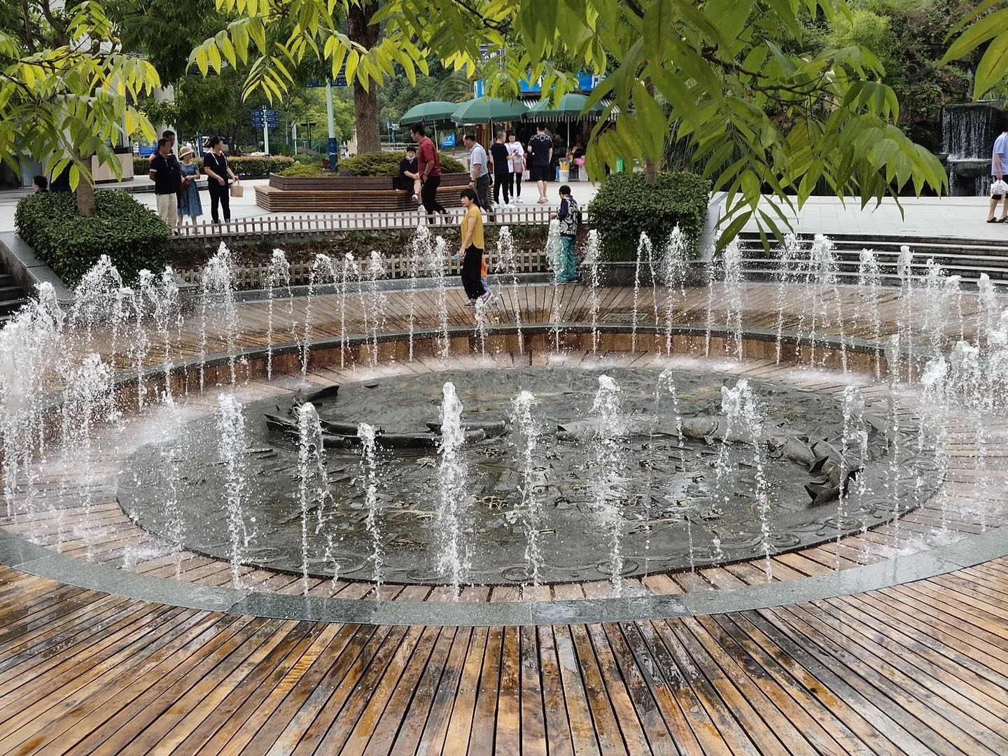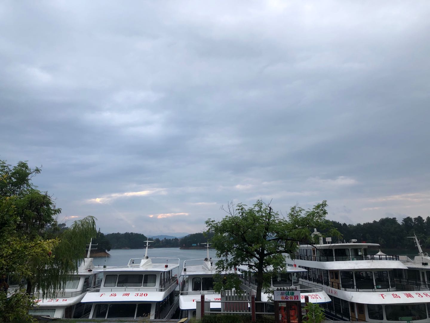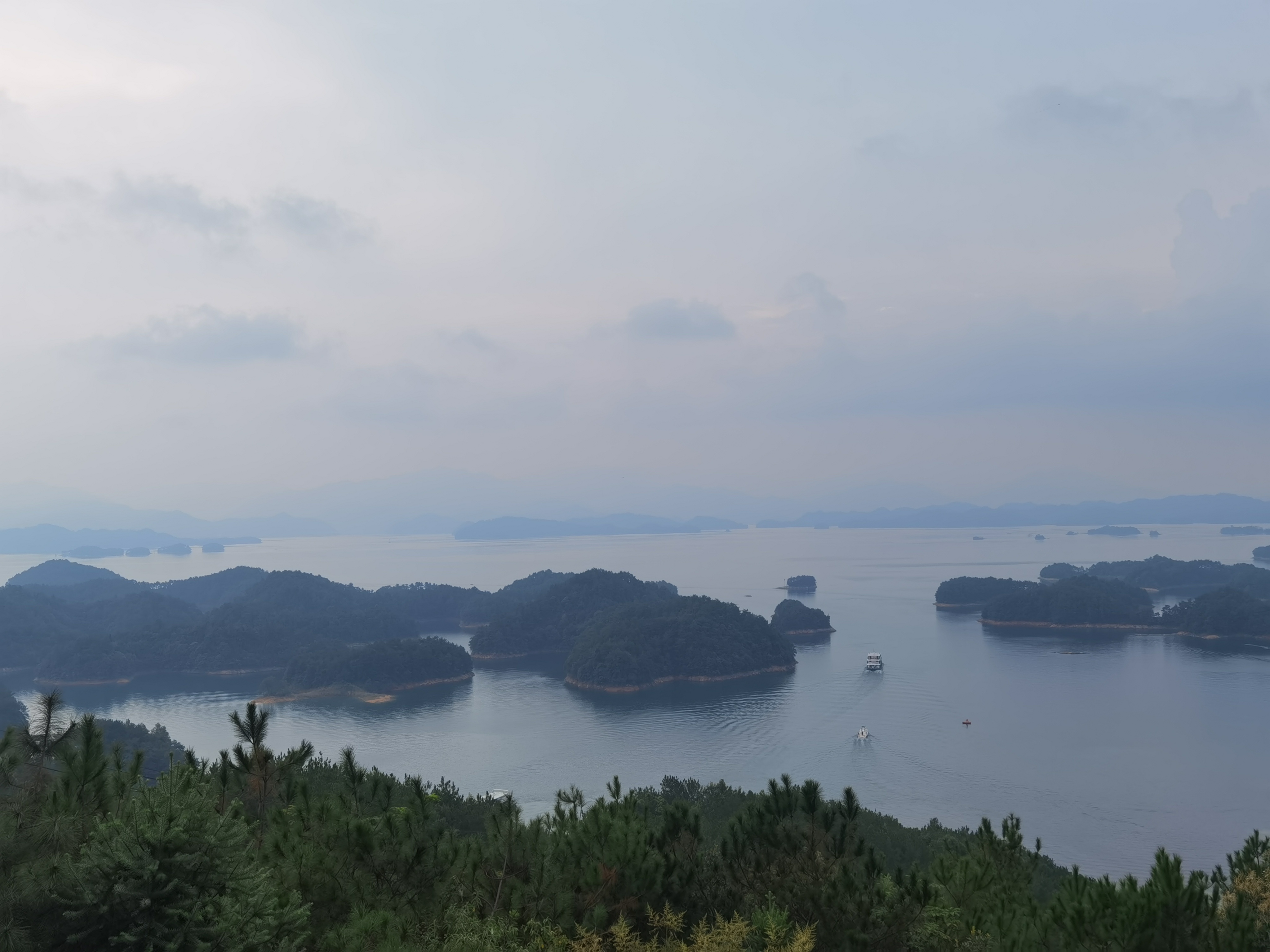 第二日早起,來到千島湖中心湖區,我們登上游船,天氣也是陰蒙蒙的,前方的島嶼在眼前若隱若現,猶如仙境般的感覺,空氣清新,是個修身養性的好地方。吃過午飯,大概下午2點半下的游船,我們來到秀水文化街,這里承襲著淳安傳統文化。江南建筑典型的雕塑、牌坊、庭園等吸引著我們,有些同事買了當地的一些雕塑紀念品帶回去送給小孩、家人。再往前映入眼簾的是水景噴泉、亭臺雕塑居民古建筑等景觀設施。