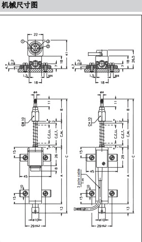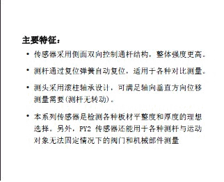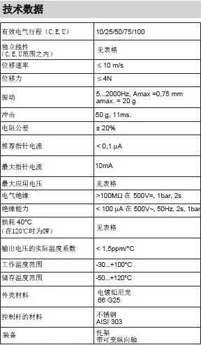 GEFRAN PY2頂珠式直線位移傳感器又稱電子尺、電阻尺等。GEFRAN PY2直線位移傳感器,電器可選電纜線以及街頭等連接方式。自帶回彈式設計,頂部采用頂珠式方式。量程50~100mm、獨立線性度±0.5%、防護等級IP65、位移速度>5m/S、最大供電電壓60vdc、重復性0.01mm、本質無線分辨率。GEFRAN PY2直線位移傳感器使用環境溫度-30~100°C、殼體材料使用不銹鋼材質、電阻公差±20%。GEFRAN PY2直線位移傳感器內部碳膜電阻涂層,配合電刷滑動實現電阻變化,從而轉換為位移量。