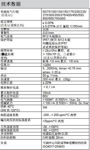 GEFRAN LT67拉桿式位移傳感器又稱電子尺、電阻尺等。GEFRAN LT67拉桿式直線位移傳感器,防護等級高達IP67。采用內部碳膜電阻涂層,配合電刷滑動實現電阻變化,從而轉換為位移量。GEFRAN LT67直線位移傳感器采用拉桿式設計,配合萬向節安裝。LT67拉桿式位移傳感器獨立線性度為±0.5%FS,量程從50~900mm可選。位移速度小于5m/s、殼體材料使用不銹鋼材質、最大供電電壓可達60VDC、電阻公差±20%。
