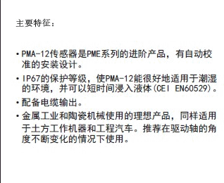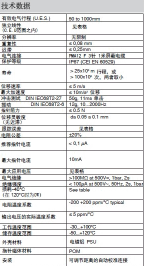 GEFRAN-PMA12磁阻式直線位移傳感器。采用磁阻式設計原理,本事無限次使用壽命,靈敏度0.1mm,重復性僅為0.08mm。意大利GEFRAN PMA12磁阻式直線位移傳感器,防護等級高達IP67,適用于惡略潮濕、高粉塵、室外的等環境使用理想選擇。意大利GEFRAN PMA12磁阻式直線位移傳感器采用拉桿式設計,配以魚眼軸承及磁環附件。GEFRAN PMA12拉桿式位移傳感器獨立線性度為±0.5%FS,量程從50~1000mm可選。位移速度小于5m/s、殼體材料使用不銹鋼材質、最大供電電壓可達60VDC、電阻公差±20%。