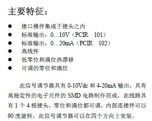GEFRAN-PCIR101/PCIR102信號變送器。可將電阻信號轉(zhuǎn)換為電壓0-10V或者電流4-20MA模擬量信號。方便采集系統(tǒng)監(jiān)控。并且該信號變送器可調(diào)整零點(diǎn)及滿量程,方便用戶自行標(biāo)定。我們的產(chǎn)品在工廠通過了各種環(huán)境測試,例如超壓測試、疲勞測試、電氣穩(wěn)定性測試等等。