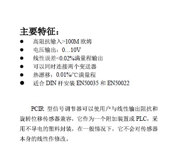 GEFRAN-PCIR信號變送器。可將電阻信號轉換為電壓0-10V或者電流4-20MA模擬量信號。方便采集系統監控。并且該信號變送器可調整零點及滿量程,方便用戶自行標定。我們的產品在工廠通過了各種環境測試,例如超壓測試、疲勞測試、電氣穩定性測試等等。