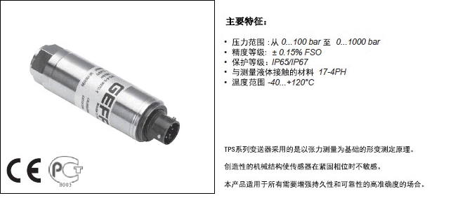 GEFRAN TPS壓力傳感器采用優質材料制成,并且通過了歐洲質量體系認證。GEFRAN TPS壓力傳感器/變送器在工廠通過了各種環境測試,例如超壓測試、疲勞測試、電氣穩定性測試等。